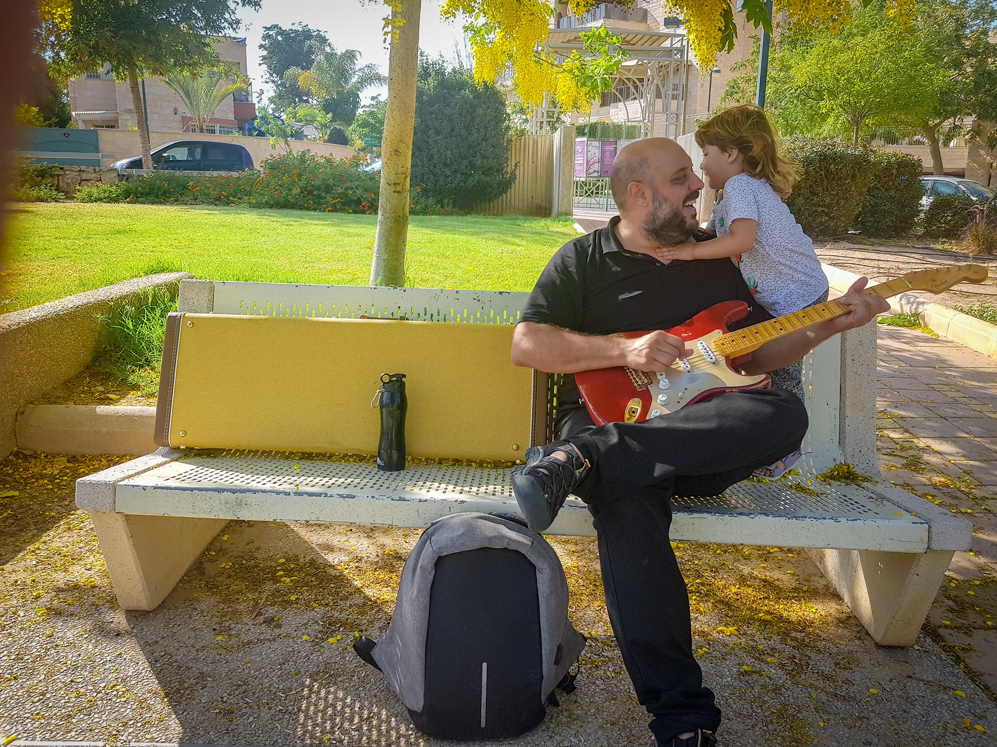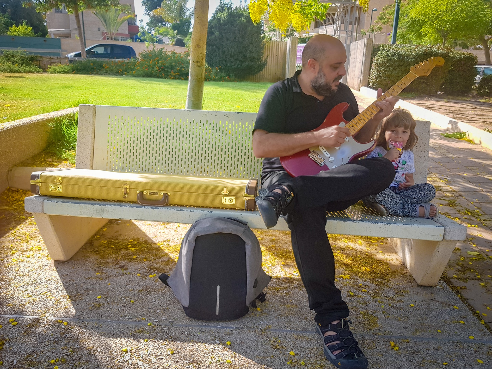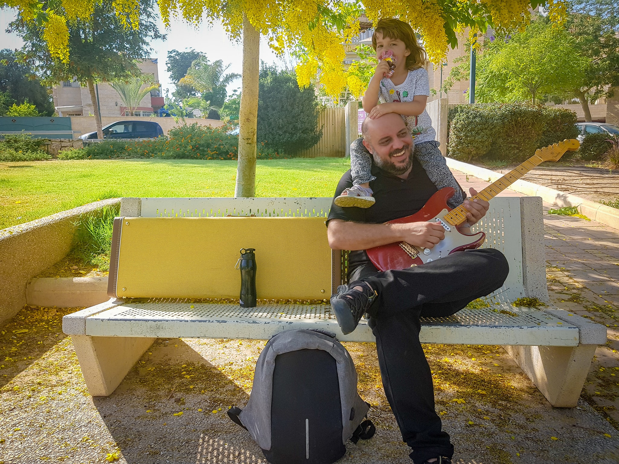 קניתי אותה, ושבתי הביתה במהירות לחץ, עם דופק של כלה חרדית בליל חופתה. רציתי לחבר אותה למגבר ולבדוק שלא יצרתי מפלצת זכרונות מדומיינת. אבל כמו תמיד, דווקא שאתה הכי רוצה, יש כל כך הרבה דברים לעשות לפני. הוצאתי את הילדות מהמסגרות. ודווקא באותו היום הן החליטו שהן לא רוצות ישר הביתה אלא לשחק ולשחק ולשחק בפארק ליד הארטיקיה. באיזה שלב, מרוב דחיקות ודחיפות, שלפתי אותה מהקייס וניגנתי עליה באמצע הפארק בלי חשמל, הביטו בתמונות המצורפות שצילמה מעיין ותראו אדם מאושר ומלא באהבה קורנת שממיסה ארטיקים.