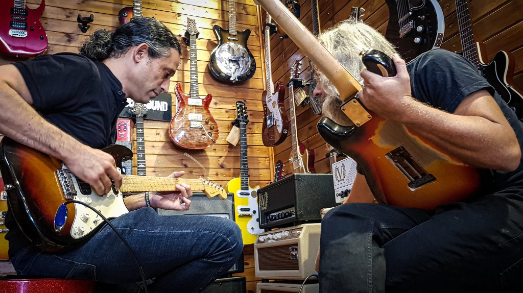 בדקנו שתי גיטרות, אחת שהיתה ממש כמו סטראט, ואחת מודרנית יותר. לא היה צל של ספק שמדובר בגיטרות טובות אבל שנינו חשנו כי הגיטרות מצלצלות ומנגנות כמו משהו שהיה מודרני מדי לטעמינו. הרגשנו שהן יהיו גיטרות נהדרות להעמיס עליהן המון אפקטים, אבל כפי שהן היו, ברמת הבסיס, היתה תחושה שחסר לגיטרות האלו את אותו אלמנט חמקמק – אופי.